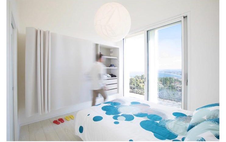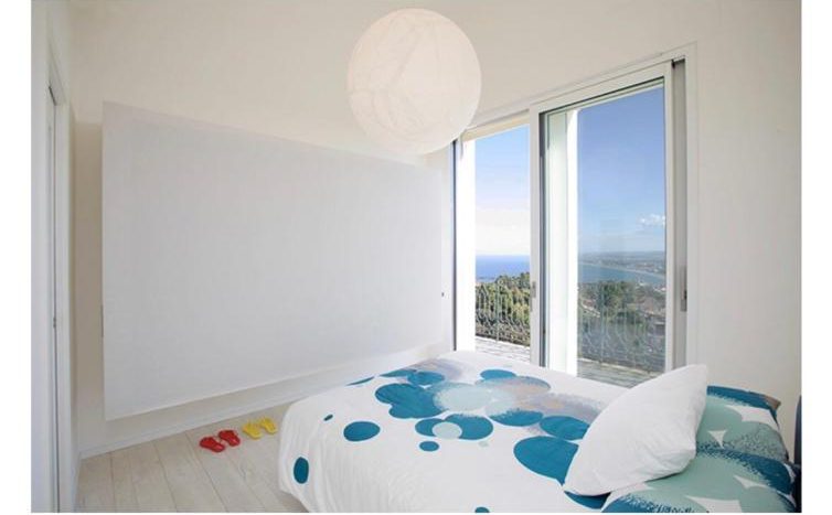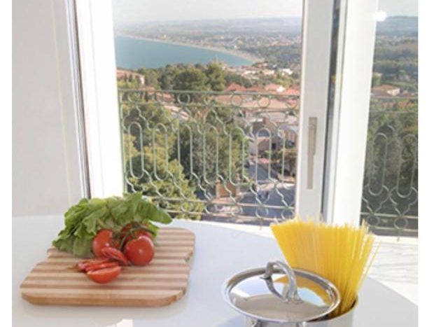 entrance into the living room surrounded by numerous windows that open onto a unique panorama including the Conero promontory, the Numana bay and the Sibillini mountain range; the well-equipped kitchen corner with the dining table and chairs.