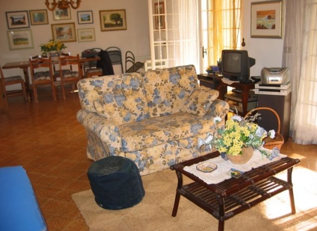 large porch well equipped with furniture, living room with sofas and dining table, kitchen and pantry, double bedroom and en suite bathroom with walk-in shower, bedroom with 2 single beds and internal bathroom with walk-in shower, laundry, ironing.