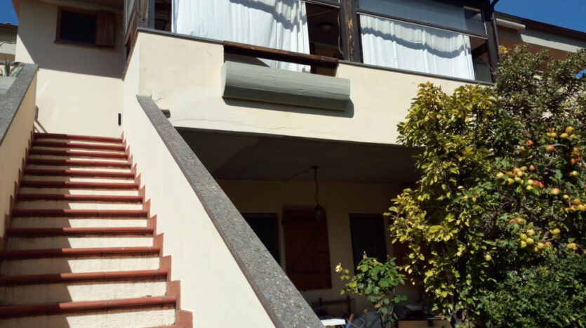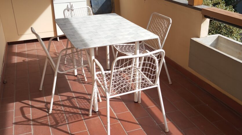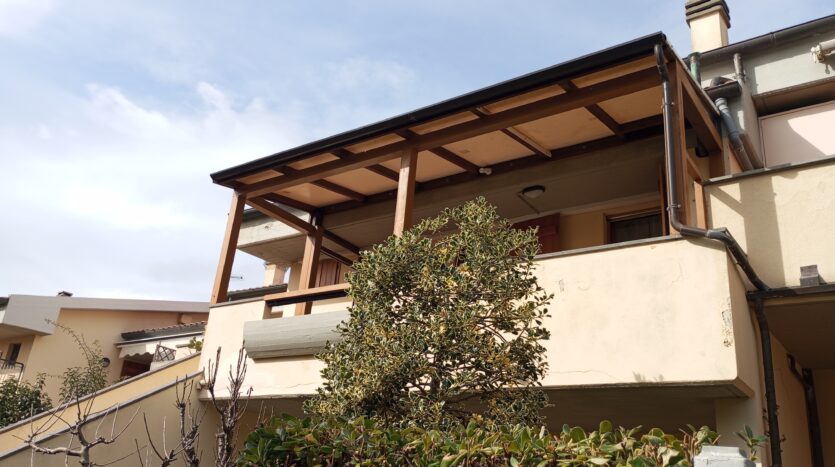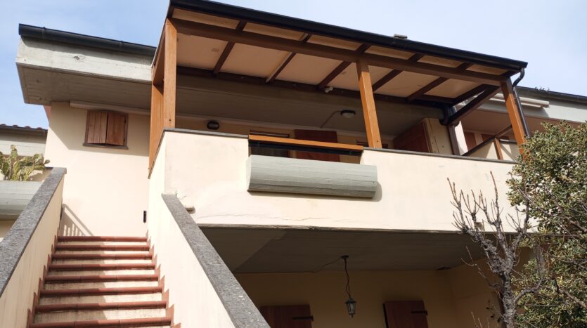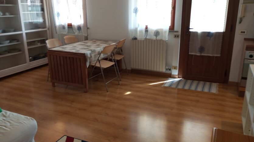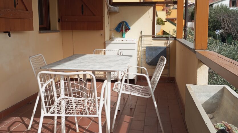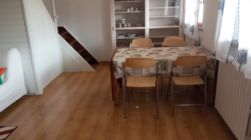 alloggio posto al piano primo ed ultimo a numana via della selva,21 facente parte di piccolo edificio per complessivi n 8 appartamenti distribuiti tra il piano terra e primo. Zona silenziosa con strada di accesso terminale, fresca nelle calde giornate estive per la vicinanza di una boscaglia, ma complessivamente comoda alla spiaggia ed ai servizi raggiungibili in passeggiata oppure usando il frequente servizio comunale di bus navetta. La casa ha pertinenza di posto auto adiacente l’edificio, scala esterna per raggiungere l’alloggio entrando da piccolo cancello ed attraversando il terrazzo a livello casa; ingresso nell’ampia stanza giorno con tv color dove troviamo il mobilio completo di angolo cucina e frigo/freezer, zona pranzo con tavolo e sedie, angolo seduta con divano letto x n 1 pax e caminetto, camera da letto matrimoniale con ampio guardaroba, bagno con cabina doccia e lavatrice. Il terrazzo di buone dimensioni e coperto da pergolato è dotato di arredo con tavolo e sedie. Distanza dalla spiaggia e centro/passeggiata serale mt. 500.