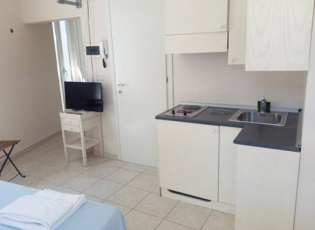 L’appartamentino si compone di; locale con letto matrimoniale + letto singolo (pax n.3), angolo cucina con fuochi ad induzione elettrica, tavolo da pranzo e sedie x n 3 pax, bagno con cabina doccia, n.2 terrazzi vista mare.
